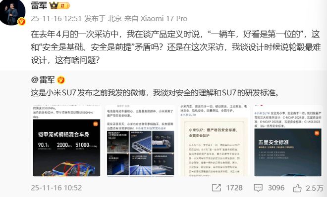 点击上方↑“电动智家”关注,记得加☆“星”!据第一家新闻报道,11月16日,小米创始人雷军在微博上连发多条帖子,针对近期小米汽车安全争议事件表达“愤怒”。对于一向表现得温文尔雅的雷军来说,这是一次非常罕见的“防守突破”。他在微博上小心翼翼地指出:“去年4月接受采访时,谈到产品的意义时,我说,‘车首先要好看。 “这是否违背了”安全是基础、安全是前提? “或者在这次采访中,当我谈到设计时,我说轮子是最难设计的,这有什么问题吗?”雷军的声明主要是澄清其言论中存在的不合时宜的问题。他附上了2023年和2024年发布的四张微博截图,强调了小米在车辆安全方面的投入和标准。他在网友评论中表示d 更直接地说:“互联网上很多人断章取义,进行反抗和诽谤。”为了证明小米汽车对安全的重视,雷军晒出历史微博截图为证。他在2023年12月28日的微博中提到:“电池是电动汽车主要也是最昂贵的部件,小米采用了最严格的安全标准。” 2024年1月3日,他明确表示:“小米汽车把安全放在第一位。被动安全、主动安全、电池安全、隐私安全,四重保障,全面保护。”这场争议的根源可以追溯到去年4月的一次采访。当时,雷军在谈到产品定义时表示:“我们在产品定义中首先定义的是外观为王,漂亮的车是第一位的。”这一段话最近被重新引用,因为“小米汽车只注重外观,忽视了安全”。在对此,雷军不仅否认了这一说法,还反问道:“在这次采访中,我在谈到设计时,我说轮毂是最难设计的,这有什么问题吗?”显然,他对自己言论的片面解读并不满意。雷军的强烈回应毫无根据。表面上看,小米汽车表现不错。 2025年第二季度财报显示,小米集团总营收将达1160亿元,同比增长30.5%,连续三个季度突破千亿大关。智能电动汽车、人工智能等创新业务表现尤为出色,收入增长233.9%至213亿元。更令人印象深刻的是,小米第二季度交付汽车81302辆,7月份累计交付超过30万辆。然而,在这些辉煌数字的背后,小米汽车却面临着一系列产品信心危机。从从“碳纤维前舱门”争议到“马力锁”争议,小米汽车的一举一动都受到放大镜下的审视。近期,小米汽车经常对多起版权诉讼提出“附属异议”,要求将案件从消费者所在地法院移送北京法院审理。这种策略被指责可能被用作“消耗战”的工具,进一步引起了公众的怀疑。雷军庞大的个人IP流量给小米汽车带来关注的同时,也带来了争议。从造手机到造芯片再到造汽车,小米每次进入各个领域都伴随着质疑和挑战。汽车的安全性和外观并不相互排斥。但对于渴望扎根汽车行业的小米来说,如何在舆论漩涡中保护自己,构建健康的竞争环境,是比应对“Q”更紧迫的问题。断章取义。”