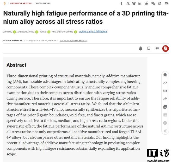 9月2日,9月2日,中国科学院金属学院宣布,它已成功开发了一种新的3D后加工技术,以制备具有“全能”疲劳性抗性的钛合金材料,从而破坏了抵抗金属材料疲劳的世界。相关研究结果于2025年8月22日发表在“科学进度”(IT Home Appendix doi:10.1126 / sciadv.ady0937)中。中国科学院金属学院的特别研究助理Qu Zhan是该论文的第一作者,研究员Zhang Zhenjun,副研究员Liu Rui,研究员Zhang Zhefeng是本文作者的作者。该结果表明,具有复杂拓扑结构并承受复杂负载的钛合金物质的自然益处,san anti fatigue,并将其作为在航空航天和其他田野上承载负载的动态组成部分奠定基础。同时,这个StUdy还为此提供了新的想法 - 在不同的应力比与合金合金的不同压力比下,优化疲劳性能设计。根据中国科学院的说法,3D打印完全达到了对新一代飞行设备的光线和高度整合的基本需求,并具有独特的复杂金属组件的独特开发,并有望取代传统的制造方法,以实现基本高端设备的智能生产。但是,该应用的巨大前景长期以来遭受添加材料安排和成分的总体疲劳特性的普遍影响。为了解决3D印刷材料疲劳的国际问题,2024年2月,中国科学院金属研究所的材料疲劳和团队断裂,钛合金团队共同建议调节组织和缺陷,并成功准备好了疲倦的疲惫的疲惫的疲倦的疲倦,Disteryi distanii distertigue,Destarti destarti distertigue,distarti destarti destarti,觉得遇到所有材料的疲劳世界,并更新对3D印刷材料性能疲劳的人的先前了解。但是,实际工程组件的服务气氛通常非常复杂,通常伴随着应力负荷比的显着变化。当改变材料或桑卡普的外部应力比时,环状应力分布和最大应力的比例也会改变,从而影响不同的疲劳机制之间的过渡。这种“一个定律正在上升,另一个正在下降”,使传统合金结构难以在应力比的完全发生率下保持良好的疲劳性能。一种类型的微观结构通常仅显示应力比的特异性发生率中对疲劳的抗性。 ▲在不同类型的微观结构下,疲劳的强度和相应的TI-6AL-4V合金的开裂机理在不同的应力RA条件下TIO。特别是对于具有复杂结构的添加剂制造成分,实际服务过程中的应力分布更加复杂,并且不可避免地疲劳,应力比率可变。因此,如何在应力比的整个条件下实现疲劳的高阻力是确定是否可以将添加剂制造技术应用于大型航空航天量表和其他领域,这也是需要轻松解决的科学问题之一。 ▲在不同的应力比率疲劳断裂和疲劳裂纹的相应机制下,Net-AM结构TI-6AL-4V合金。 (a)应力比r = -1:微孔缺陷裂纹; (b)应力比r = -0.5:微孔缺陷裂纹; (c)应力比r = 0.1:微孔缺陷裂纹和微结构裂纹的统一; (d)应力比r = 0.5:微结构裂纹; 。为了应对新的挑战,物质疲劳和巴厘岛研究团队最近系统地被系统地进行了Hree典型的“疲劳短块”,容易在钛合金中开裂及其敏感的应力间隔。已经发现,无微孔添加剂制造(Net-AM)组织可以实现三种类型的疲劳短块的协调优化。基于此,小组明确指出,在应力比的全部条件下,3D打印的钛合金仍然具有天然的疲劳性高度。基于第一阶段的团队的原始NAMP过程,制备了具有大致无微孔的Net-AM Tissue Ti-6AL-4V合金,并且表征了各种应力比下疲劳和疲劳的破裂机制的强度。大量的数据比较综述表明,在应力比的全范围内,疲劳的强度不仅比所有合金材料都好,而且比所有金属材料都更好(应力分化疲劳)优于所有合金材料(应力疲劳)。s。 ▲与TI-6AL-4V和公共金属结构的其他合金相比,在不同的应力比下,Net-AM Ti-6Al-4V合金的Net-AM结构的疲劳分布。 (a)与平均应力相比的应力振幅; (b)与材料密度归一化的平均应力相比,通过材料密度标准化的疲劳强度。
