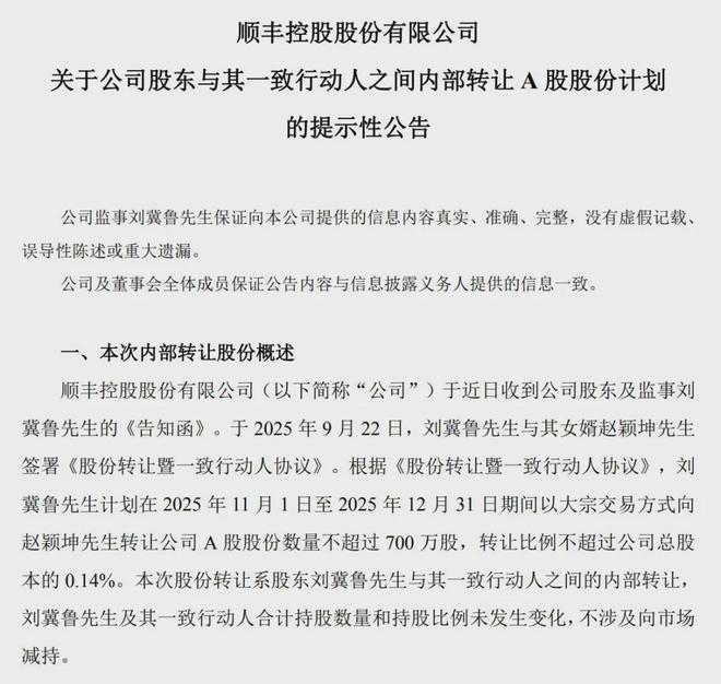 A股市场诞生了“中国的好婆婆”。 SF Holdings '78-旧主管Liu Ji和Shandong计划将他与daughter妇Zhao Yinging持有的公司持有的一些公司,后者引起了市场讨论激烈的讨论。 SF Holdings搬迁了28000万元的股份,宣布,该公司的股东和主管Liu Ji-Lu和他的daughter妇Zhao yinging签署了“股份转让和行动协议”,该计划计划将不超过700万个a-sing A-Singer-Singer-Singer-Singer-Singersing Transactions Shingtactions Shing Angions Singtactions Shingactions Plannations Plannations Plannations Shangations Plannations Plannations Shangations Shangations Plannations Sparting Family 1和12月。基于9月23日的SF处理价格以40.39元的价格收盘,此时将转让的700万股股票的相应市场价值约为2.82亿元。关于这种共享的Posibleng撞击,SF Holdings清楚地指出,搬迁后,Liu Ji和Shandong的转移将从目前的0.71%降低至0.57%,而Zhao Yingin则将转移G将是公司股东的股东比率为0.14%。但是,这种股权的变化不会导致公司控制的变化,或者将对公司和公司管理结构的当天(到日期的劳动和运营)产生重大影响。该公司仍将保持稳定的发展速度。许多年前,“出售壳”获得了56亿元人民币的巨额利润。根据2024年的年度报告,Liu Ji和Shandong出生于1947年和78岁。他在Anhui大学拥有经济背景和管理。从1994年到2016年,他担任Maanhan Dingtai Metal Products Company,Maannan Dingtai Technology Co,Ltd。的董事长兼总经理,以及Maannis Dingtai Rare Earlen New Material Co,Ltd.的董事长兼总经理,自2016年12月起,他一直担任SF Holdings的主管。应该指出的是,SF Express通过后门Dingtai新材料进入了资本市场。协调2003年5月13日,货币资本捐款的年度报告,SF Holdings Co.,Ltd。)。 Maannhan Dingtai的技术已正式更改为Maanhan Dingtai Rare Earth New Material Co,Ltd,2007年10月22日,然后于2010年2月5日发布了RMB Common共享,并列出了深圳证券交易所。在2016年的决策中,经过中国证券监管委员会的批准,SF Holdings进行了一系列重大安排,包括重大更换替代者,释放股票以购买所有权和增加匹配资金。完成重大资产重组后,深圳Mingde Holdings Development Co,Ltd成为母公司和最终的SF Holdings Company,Wang Wei是对SF Holdings的最终抑制。在SF控股公司完成其名称更改并正式进入资本市场之后,该公司的股价在7天的7天内达到了阳光日至周的限制,以及股票的市场价值,以及持有的股票市场价值。刘吉和山东强烈升起。根据此时的CCTV财务报告,通过这项后门交易,股权市场Ni Liu Ji和Shandong的价值增加了56亿元人民币。有了这笔收入,他多次是资本市场中“资本运营工业转型”的常见案例。上半年的SF快车收入和收入增加。 8月28日晚上,SF Express Holdings揭示了一份2025年的半年前报告。在今年上半年,收入达到1468.5亿元人民币,增长了9.26%;与股东相关的净利润达到57.3亿元人民币,每年增长19.37%;与股东相关的净利润增加到3.9%,每年增加0.3%;净免费现金流量为87.4亿元人民币,增长了6.1%。财务报告指出了行业竞争强度提高的环境,SF Express实现了Breakth与差异的粗糙 - 产品及其市场共享的各种策略有所增加。同时,该公司正在国外迅速发展新的行业情况和新市场。在最前沿,SF Holdings在其财务报告中指出,行业一级的“反低价内部解决方案”和“快递保证”将有助于加强行业的竞争环境。最近,表达运输行业带来了一波价格上涨。按照以下在广东,千江,海伦江和其他地方采取的行动,上海的主要表达送货公司已于9月下旬加入了价格调整通知。一些行业内部人士认为,在政策驱动的政策的双重论文和行业的顶峰下,整个国家的交付价格上涨可能是一个普遍的趋势。公司价格上涨的影响是什么?千江证券认为行业价格可以继续继续下去,预计加盟商和上市公司的业绩将被收回。随着9月的高峰时段的出现,价格可能会稳定和反弹,更大,并且预计该行业的交付性能和情感的表达将实现分阶段的恢复。 Dongxing Securities指出,价格上涨的上涨将大幅增加行业收入,并预计该行业的单价收入将持续一段时间。