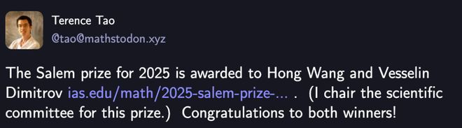 10月28日,青年女数学家王红荣获2025年塞勒姆奖。据悉,塞勒姆奖被认为是菲尔兹奖的风向标。 1968年至2024年的56位塞勒姆奖获得者中,诞生了10位菲尔兹奖获得者,菲尔兹奖是数学领域国际最高奖项之一。获奖名单公布后,前塞勒姆与菲尔兹奖获得者陶哲轩立即发来贺电。陶哲轩发来贺电。值得一提的是,在颁奖的前一天(10月27日),世界华人数学家大会ICCM数学金奖被授予邓宇、王宏和袁新夷。 ICCM数学金奖获得者 据了解,世界华人数学家大会由丘成桐发起,每三年举办一届。与菲尔兹奖一样,它仅限于45岁以下的人,被称为“中国菲尔兹奖”。这意味着短短两天时间,王宏就获得了两项重大“菲尔兹奖”奖项。资料显示,王红1991年出生于广西桂林市平乐县沙沙镇,2008年至2011年就读于北京大学本科,原就读于北京大学地球与空间科学学院,后转入数学科学学院。 2014年,王宏获得巴黎综合理工大学工程学位、巴黎第十一大学硕士学位。2019年,获得麻省理工学院博士学位;随后在普林斯顿高等研究院担任博士后研究员。图为青年数学家王红 来源:中国妇女报 王红是美国加州大学洛杉矶分校助理教授,纽约大学库朗数学科学研究所副教授、教授,现任该校终身教授。法国高等研究院 (IHES)。值得一提的是,王红是IHES历史上第一位女性终身教授,也是该所数学领域第14位终身教授。 IHES 过去 13 名终身教授中有 8 名获得过田野奖章。据悉,王宏此次获得塞勒姆奖的主要原因是“因其在解决调和分析和几何理论中的重大开放问题中所发挥的作用”,这是主要关注点。事实上,王宏在调和分析和几何测度论领域取得了重要成就,在《Annals orf Mathematics》、《Inventiones Mathematicae》等杂志上发表了多篇文章。王宏还获得了2022年玛丽亚姆·米尔扎哈尼新前沿奖,该奖是突破奖基金会于2019年为纪念伊朗数学家玛丽亚姆·米尔扎哈尼《First Woman in Sumang -First Woman in Sumang -First Woman》而设立的在苏芒的第一个女人 -苏芒第一女性 - 苏芒第一女性 - 苏芒第一女性 - 苏芒第一女性 - 苏芒第一女性 菲尔兹奖得主,于 2017 年去世。今年 2 月,王宏与哥伦比亚大学教授 Joshua Zahl 合作,在一篇长达 127 页的论文中宣布,他证明了困扰数学界多年的挂谷集合猜想。田钢院士和魏东一坐在前排聆听讲座。今年6月,王宏教授到北京大学学术报告厅讲课,座无虚席。其中,北京大学数学科学学院研究员魏东一、学者田刚坐在第一排听讲座。徐绍航、杜恒峰,校对|陈克明封面图片来源:中国妇女报经济报编译自成都日报、中国妇女报、北京大学数学校友会及公共信息